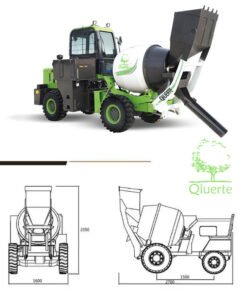 Model QET700 Self Loading Concrete Mixer Truck is a kind of unique vehicle which combines concrete mixer, transit mixer and wheel loader. The concrete output ability is 2.8 cube meters per hour. The wheel-side reducer driving axle and full hydraulic transmission case make the mixer truck move in any kinds of complex off road ways, the max. moving speed can be up to 25 km/hour, and the min. turning radius is 4.5 meters only.